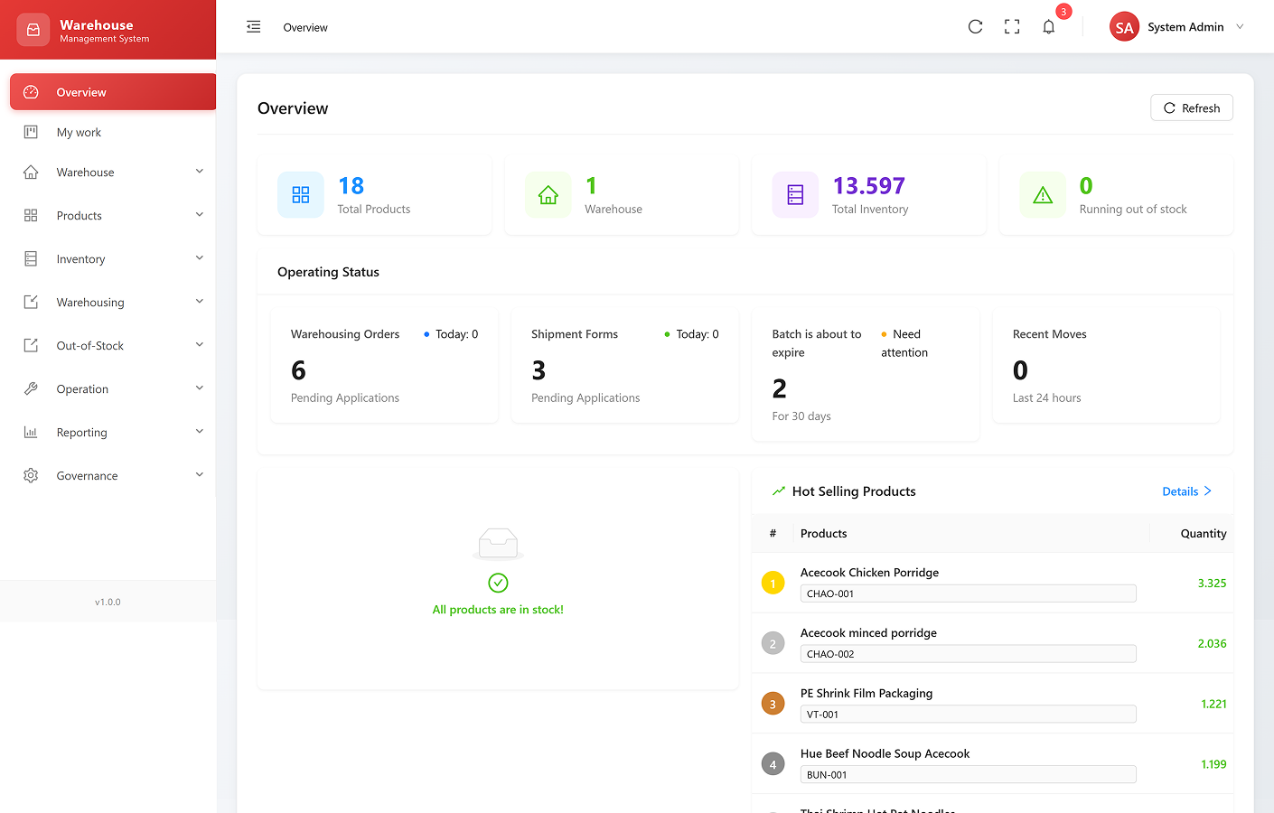 Provides a quick overview of warehouse activities: recent stock-in, stock-out, and current inventory levels.