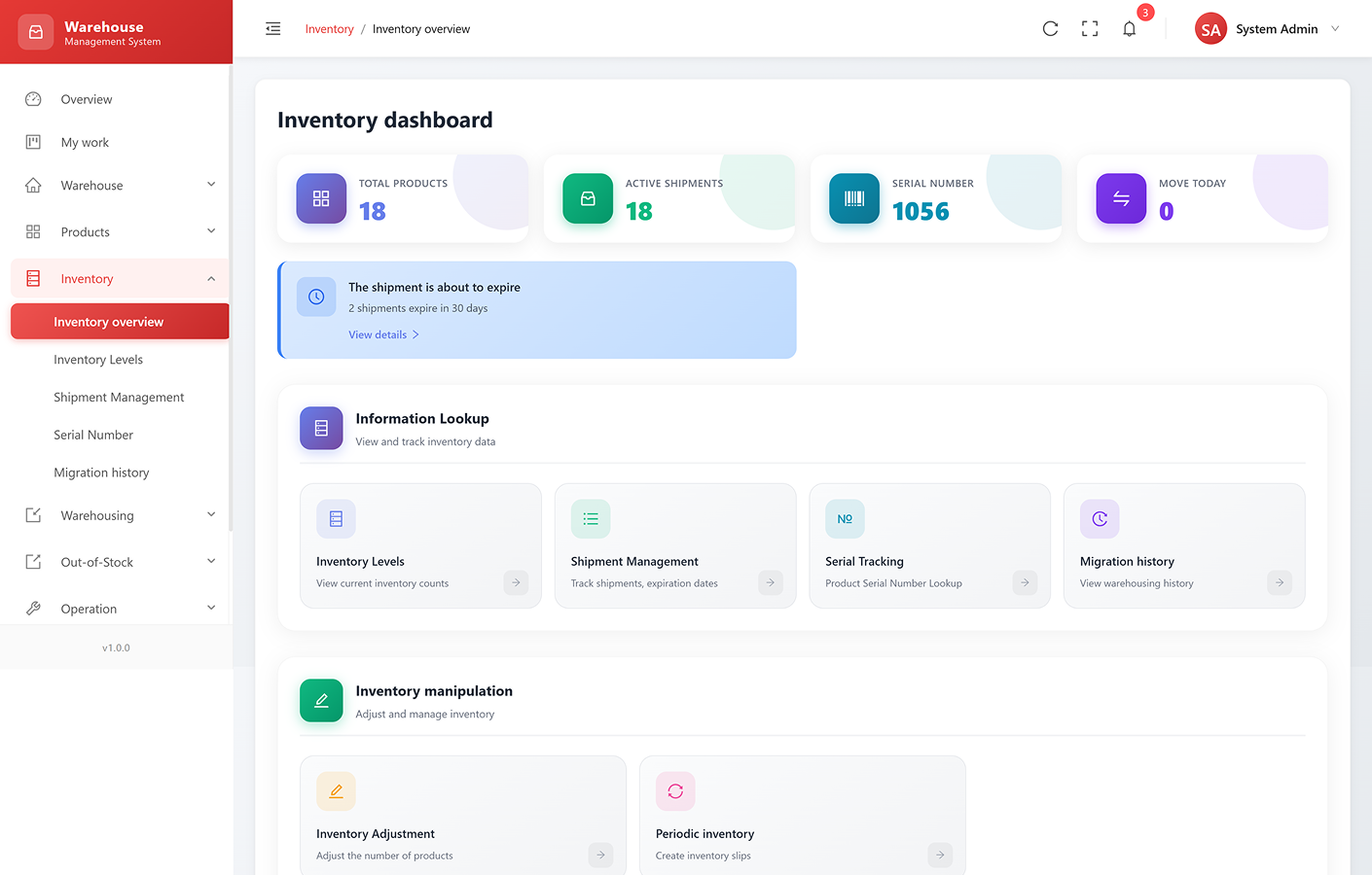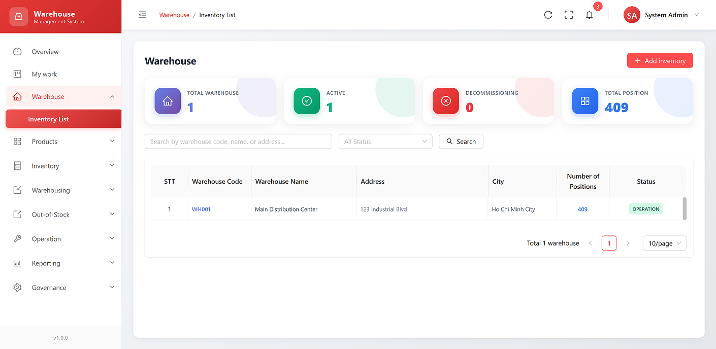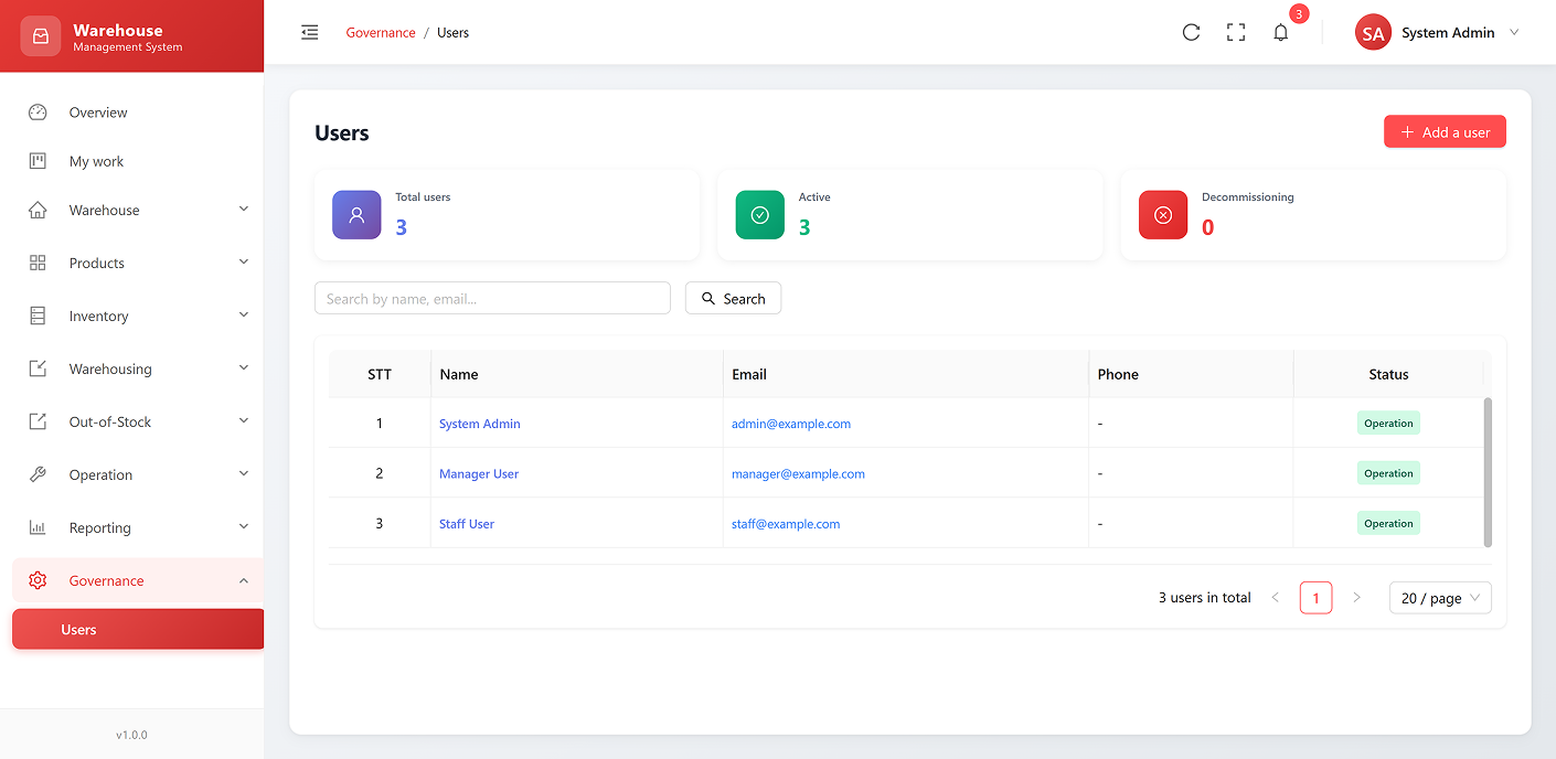 Roles: Define and manage user roles (e.g., admin, warehouse staff, accountant).